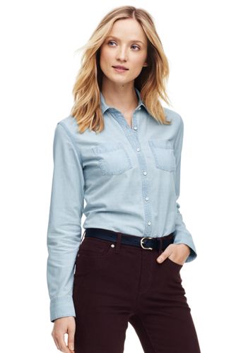 49%OFF<ランズエンド>レディス・美型シルエット・シャンブレーシャツ/無地/長袖/M/ブルー